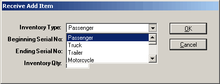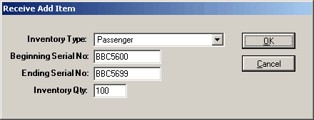 Using the packing list, enter the Beginning Serial No, Ending Serial No and Inventory Qty, then click OK.